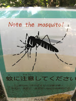 Katori senkō are a common sight this time of year, a portable mosquito repellent carried by anybody working or walking outside: they are particularly popular amongst campers, gardeners, and hikers. As the video below shows below, they can either be placed on the small metal stand and positioned in a fixed place or else put into a round case with holes in (a jumbo size one is pictured left), secured on top of a bed of glass wool, and hooked on one's belt. Either way they burn for hours, giving off smoke that is very effective at keeping mosquitoes at bay. Sales increased following Japan's first Zika virus infection last year: "bilingual" warning signs popped up all over Japan in parks and even on Kodaira's Green Road (pictured above). The fact that their main ingredient is pyrethroid (ピレスロイド) , namely allethrin, the first synthesised pyrethroid, which is highly toxic for bees, cats, and fish, doesn't seem to put any Japanese off, though perhaps it should: one piece of research noted that exposure to the smoke of mosquito coils "can pose significant acute and chronic health risks...one mosquito coil would release the same amount of PM(2.5) mass as burning 75-137 cigarettes." On second thoughts, maybe I should just play SMAP songs and hope for the best!